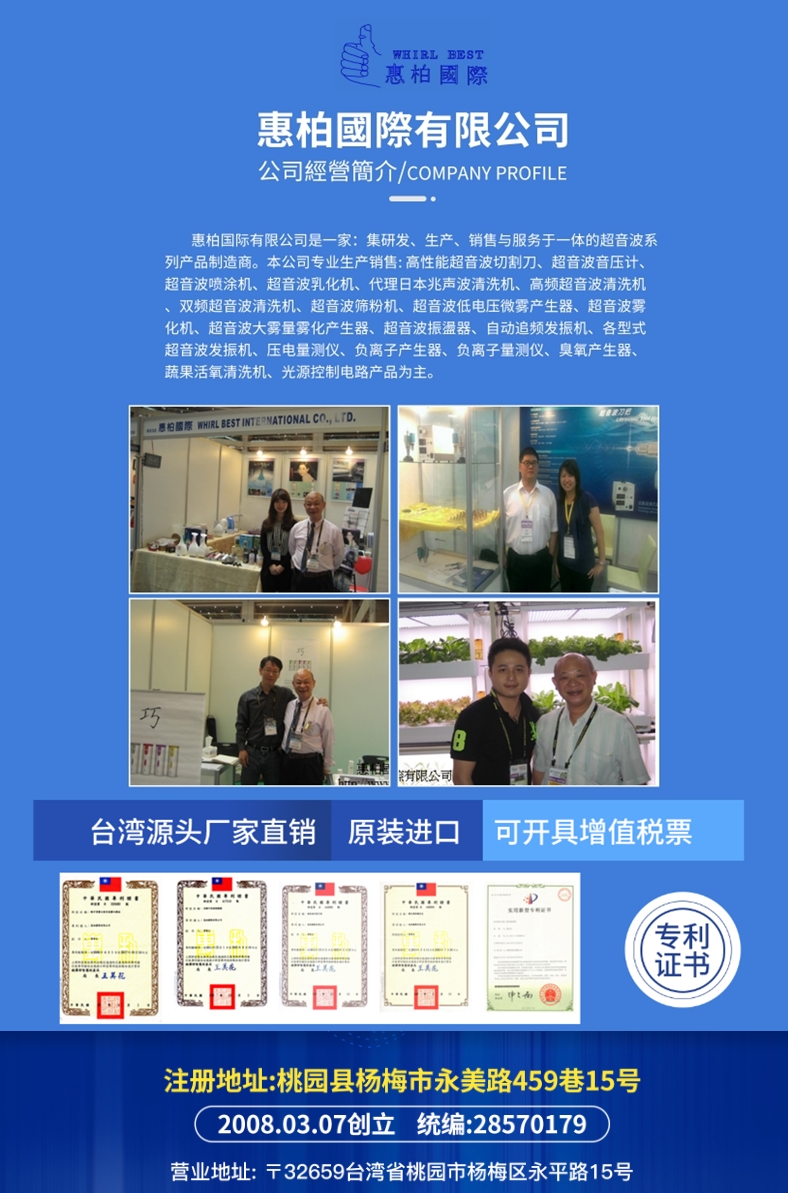 惠柏国际有限公司是日本新サン電子株式會社公司授权销售兆声超音波清洗机的中国总代理商,更多兆声波清洗机设备咨询,欢迎致电吴小姐:188-2028-2707    微信18820282707