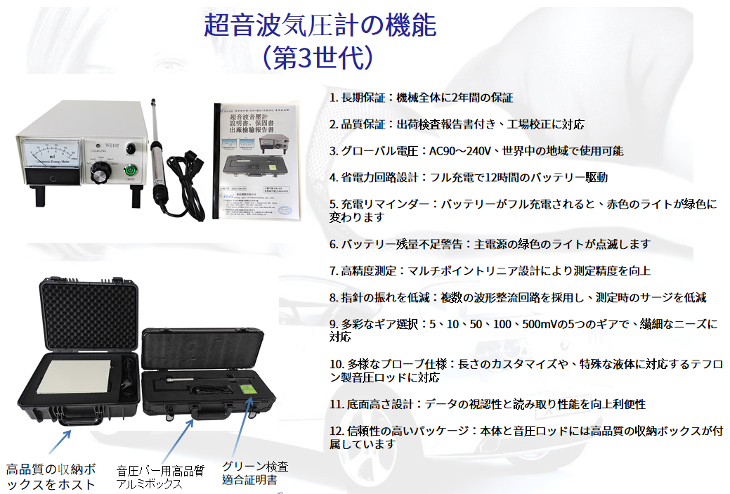 超音波気圧計は、液体中の超音波の強度を定量化できる多機能精密機器です。本製品は、ISO国際試験規格に厳密に準拠して設計・製造されています。